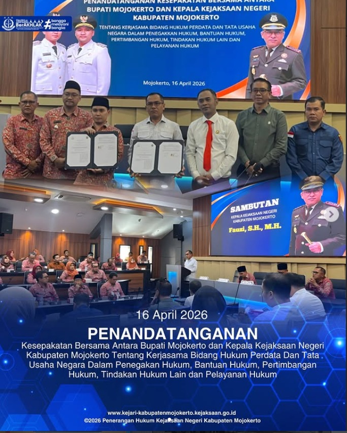 Kabupaten Mojokerto – Pemerintah Kabupaten Mojokerto bersama Kejaksaan Negeri Kabupaten Mojokerto melaksanakan penandatanganan Kesepakatan Bersama pada Kamis, 16 April 2026.