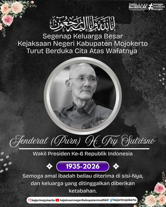 Segenap keluarga besar Kejaksaan Negeri Kabupaten Mojokerto menyampaikan duka cita yang mendalam atas wafatnya Try Sutrisno, Wakil Presiden ke-6 Republik Indonesia.